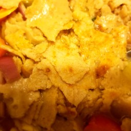 These all get mixed together before you even add the injera. This is like a bread salad and very yummy. Tear the injera in to tiny pieces and add it to the oily mixture and keep mixing and stirring until it is all mixed together and the injera should be soggy.