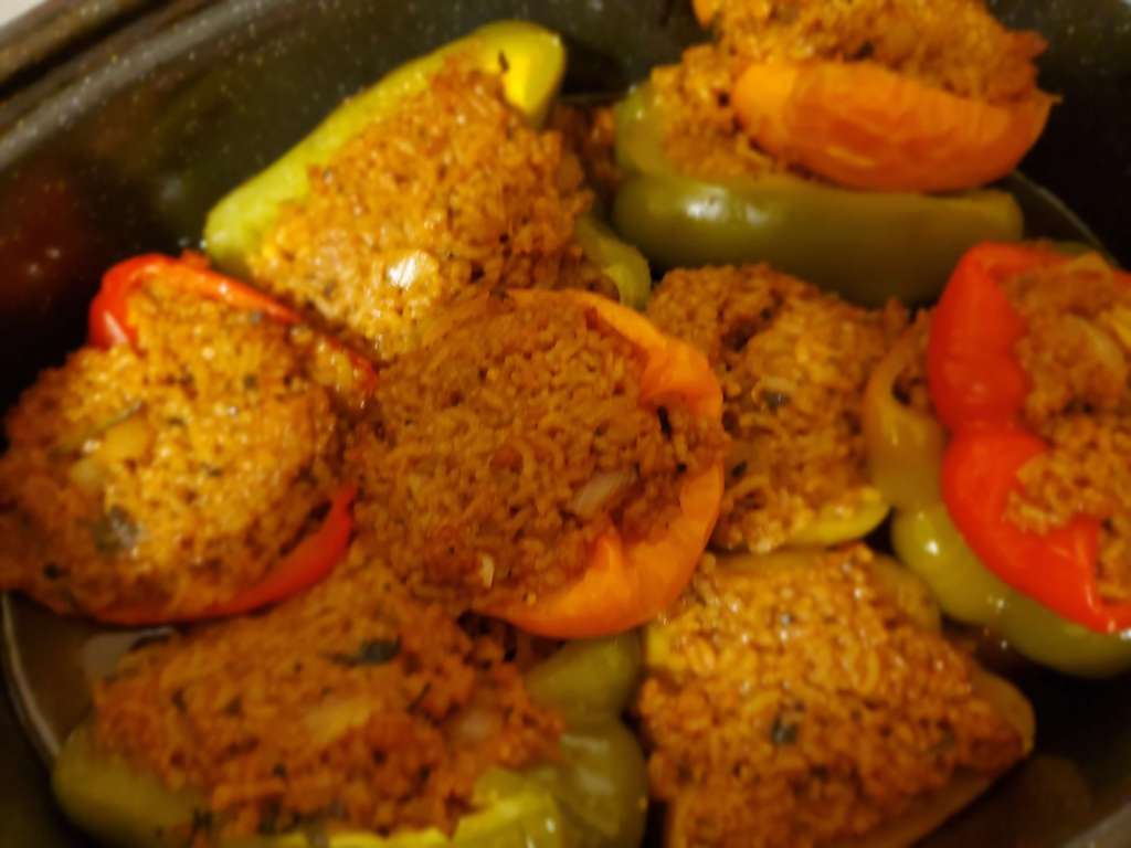 Grind 1 pinch of black peppercorns and set aside. In a pot add 1/4 cup of olive oil and another 5 tbs to a small roasting pan. Place the vegetables of choice except grape leaves and cabbage leaves if using. For now I was in a mood for bell peppers and that is what I used.