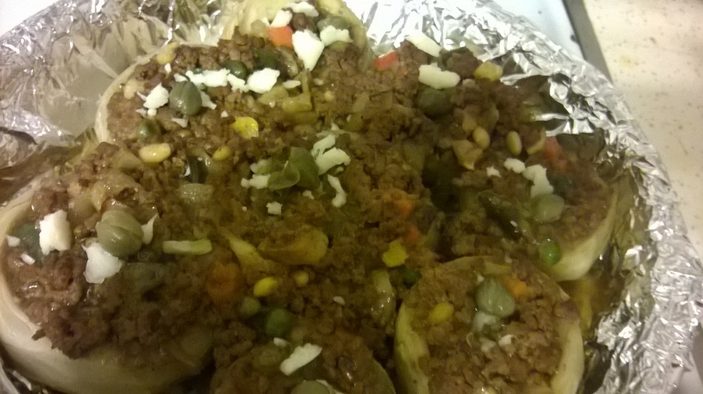 Everyone else can add 1 small bag of frozen mixed vegetables in he meat or veggie crumble mixture. Cook this for 15 minutes on low heat. Add 3 tbs of capers and 10 olives crumbled and add a drop of the brine. You do not want to add to much then it would become too salty. Take 3 tbs of cornstarch or arrowroot starch and 1/4. cup of water to make a slurry and add to the meat or veggie crumble mixture and stirr until you see a thick gravy. Turn heat off and spoon these in to the artichoke hearts: besides they look like little cups with a tablespoon. Two to Three tbs at a time is plenty.