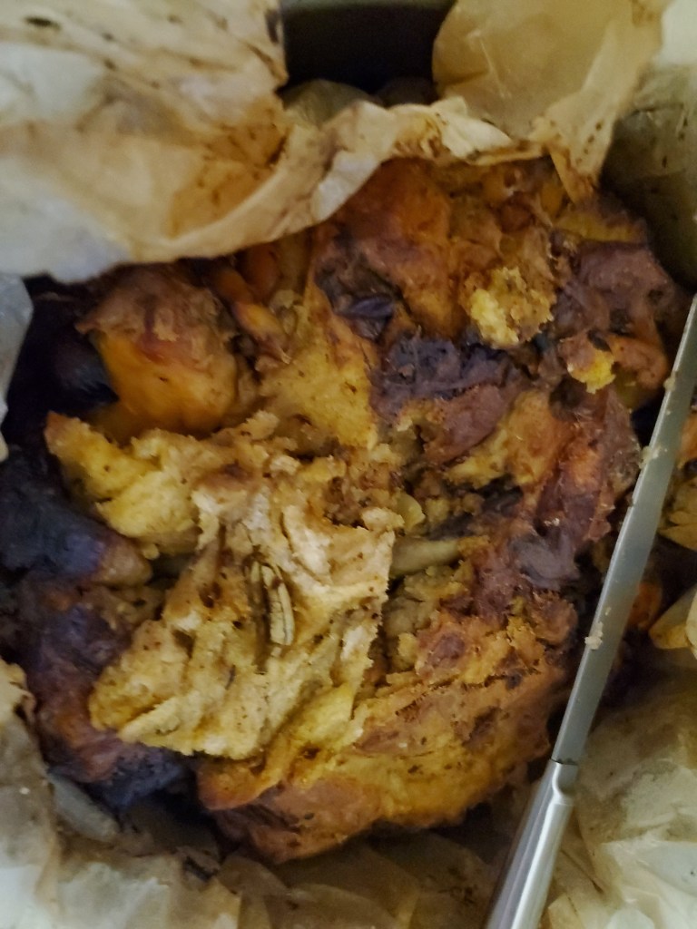 When the dough is finished proofing then add the now cooled doro wot meaning chicken stew to the dough and mix with with a large wooden spoon. Take a piece of parchment paper and ball it up and place it in the utensils that is compatible with an instant pot or other multi functional cooker. I have the instant pot duo crisp 8 quart. and as you can tell I needed 3 pieces of parchment paper for this doro dabo meaning chicken bread. Spray with cooking spray. If using an oven then you will need 1 and a large cast iron skillet or baking utensil that is big enough to bake a sheet cake in. Preheat for 400F or 200C or cook in instant pot by selecting bake the temp should be at 400F, select time for 15 minutes and press start after placing the air fry lid on top of the multi functional cooker. The time should be counting down.