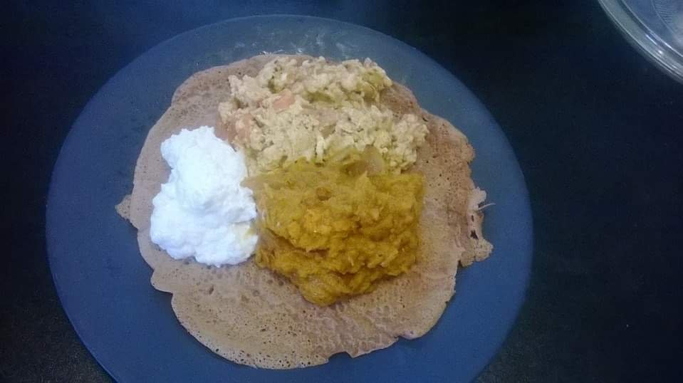 Now take the small pumpkin and cut in half and bake it in the oven for 60 minutes which is 30 minutes times two. The oven has to be on 375F or 190C. The pumkin also must be deseeded and spray the roasting pan and set the pumkin in to bake and if there isn’t any pumpkins then you can use any type of orange winter squash in its place. After it softens then add the other half of the onion diced on high heat also in cooking oil like you did for the eggs and let the onions turn brown and add the rest of the berebre, niter kibbeh and bullion cube crushed. Now you can add your mashed squash or pumpkin and add 3 dashes of maggi or knorr aroma. Let coook for 5 minutes and place on injera with your favorite piece of protien or pair it with a lentil dish.