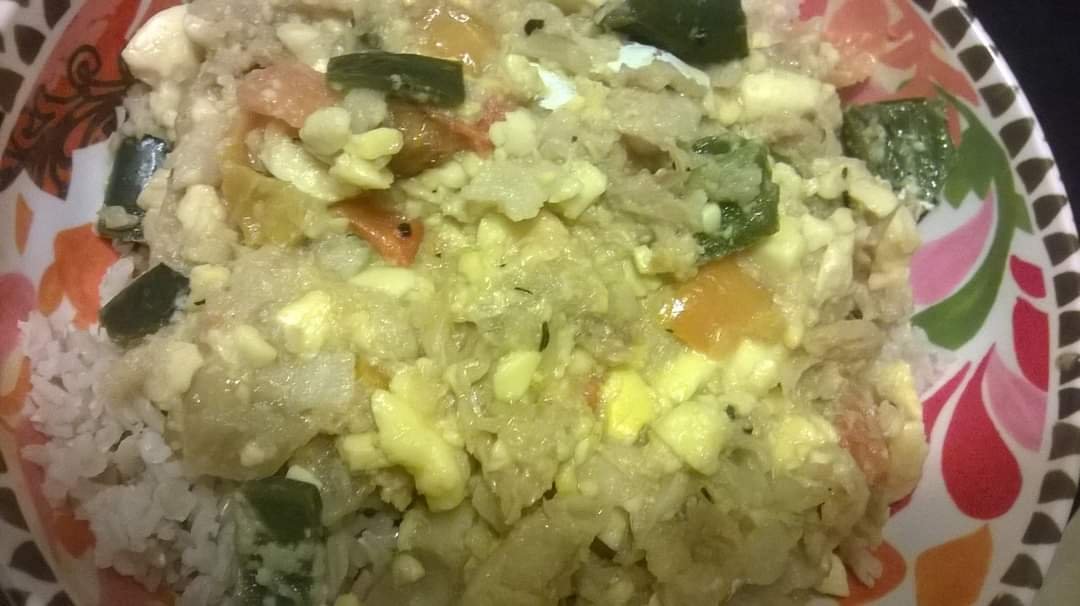 Now In a mini processor add either 1 habenero or scotch bonnet cut in half and deseeded, 1 onion or shallot, 1 tomato, 1 bell pepper of any color, rough chopped and 4 cloves of garlic. Close mini processor and pulse to blend to make a stew base like that you would for African dishes but for this dish only. In a large cast iron skillet you will need to rinse it and place it on the stove on high heat and let the water dry out of it to make it hot. Add 1/4 cup of either olive oil or sunflower oil. While waitng for that to heat up then open the can of akee and drain it and rinse it 3 times as well. Shake it out in a strainer to make sure the water is completly out of it. Add 1 pinch of peppercorns to mortar and pestle, add the contents from the mini processor and the mortar and pestle, 1 pinch each of paprika thyme and pink salt. Stir add your rinsed akee from the can and either the cooked bacalao or salted pollak if using. I used the red bell pepper for the stew and chopped 1 each of green, orange and yellow bell peppers to make it more colorful. They were chopped in to tiny pieces.