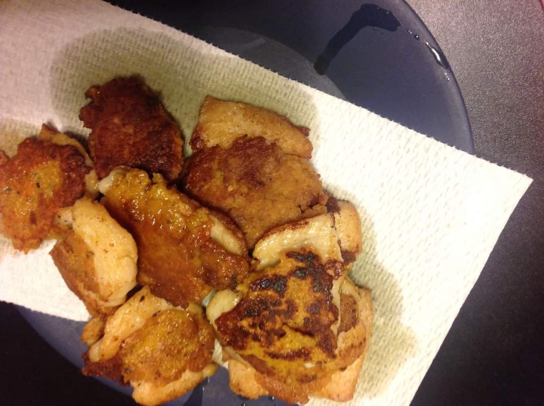 Again after you make the mortar and pestle empty you can add 1 pinch of black peppercorns to grind and add to the fish, add 1 egg, 1 handful each of all purpose unbleached flour and panko. Mix and add 1 Pinch of turmeric powder, either 1 bullion cube or 2 pinches of bullion powder, 3 dashes of maggi or knorr aroma. Wrap the fish in the bowl up with plastic cling wrap and place in the refridgertor for 30 minutes. On high heat add 1/4 cup of either corn, canola, vegetable or peanut oil in batches of 3 in a cast iron skillet. Cook 3 minutes per side turning with a pair of tongs or until it turns opaque. Remove from the skillet by shaking off the excess oil with a pair of tongs. Repeat until there are no more pieces of fish remaining and serve with stews containing lentils or vegetables on injera.