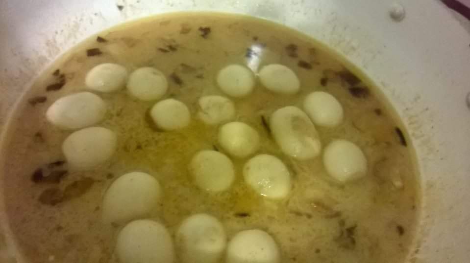 In a wok or cast iron skillet on high heat add 4 tbs of either corn, canola or vegtable oil then on top of this 1 tbs each of mustard oil, coconut oil or butter ghee. Let that get hot and add 3 curry leaves, 2 garlic cloves minced, 1 pinch each of hing, cumin seeds mustard seeds, fenugreek seeds, kalounji, shai zeera, black cumin, dill seeeds, 1 whole either 1 whole round red chili, red long chili or kasmiri chili crumble and 1 pinch each of pink salt, turmeric and red chili powder. Add 1 onion or shallot or 3 green onions chopped Let them turn brown slightly. Let crackle and combine in a bowl 1/4 cup of yogurt, 3 tbs of besan and mix together with a whisk and add 1 cup of water then add to the masla mixture in either the wok or cast iron skillet and mix. If it thickens too fast then add 1/4 cup of water a little at a time because you do not want it to be too thin either. Now open 1 can of quail eggs they are already cooked and the shells removed. All you have to do is drain them and rinse them 3 times and add to this curry forming on the stove. and that is done on low heat.