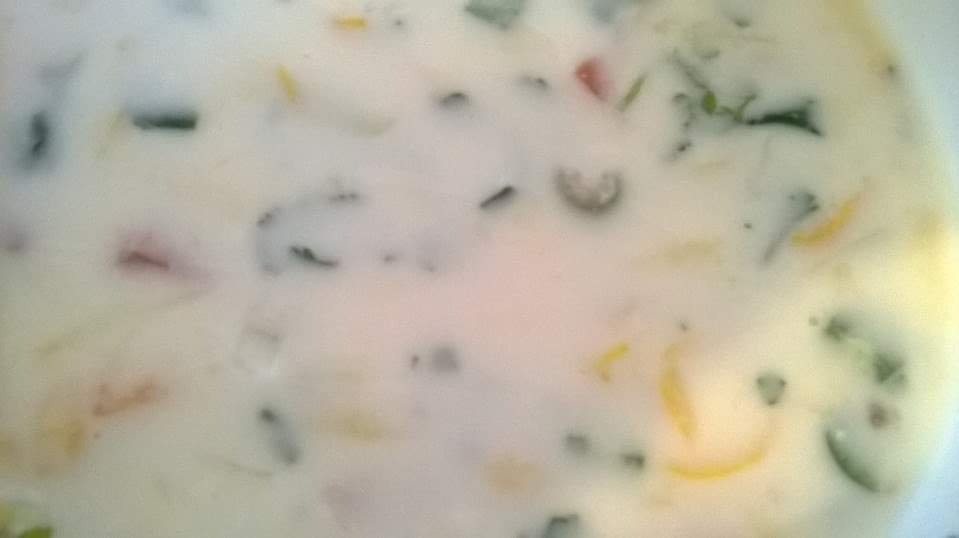 After this squash gets grated then take either 1 onion or shallot and do the same thing. When you are done add 1 pinch each of red chili powder and chat masala. Also if you do not want to add either onion or shallot that you can finely mince 3 green onions and use instead. Add 1/2 of plain Desi yogurt. I love this one because It is as creamy as it should be. Mix this little by little with 1/4 cup of water and you may not need so much but it is to loosen up the yogurt and make it more like soup. Top with either 1 pinch of either cilantro or mint and enjoy it with rice or other grain dishes.