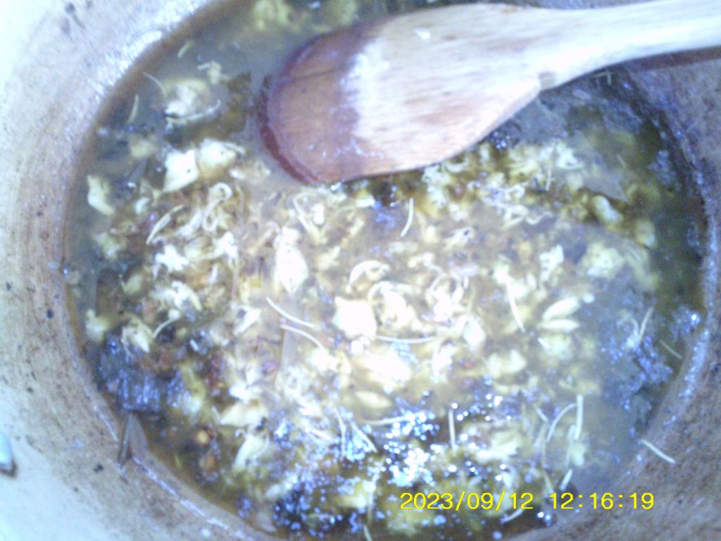 Add 1 pinch of peppercorns to mortar and pestle and the color doesn’t matter, 1 small piece of lemon rind that I cut in to pieces and store in the freezer I use for seasoning purposes. I tore off a tiny piece of this lemon rind and put it in my mortar and pestle to grind with my peppercorns. I then add this with the tomatoes in the pot. Add 1 bay leaf, grind 1 tiny piece of cinnamon stick in mortar and pestle and add to the pot with canned tomatoes. Reduce heat to low and add 1 pinch each of savory, thyme, parsley, basil, oregano, marjoram, red chili flakes, sage. The sage also gets ground in the mortar and pestle and added to the now incomplete sauce on the stovetop.
